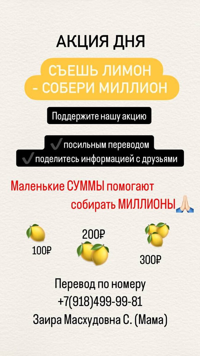 Сегодня запускаем позитивную акцию😊 «Съешь лимон - собери миллион»🍋 Поддержать Вову можно: ✔️посильным переводом ✔️поделившись информацией с другом ✔️информацией в статусе своих мессенджеров ✔️репостом и добрыми комментариями Благодаря этому, ВМЕСТЕ нам удастся достигнуть цели и Вова будет еще на шаг ближе к победе 🚀 Спасибо за поддержку 🙏🏻