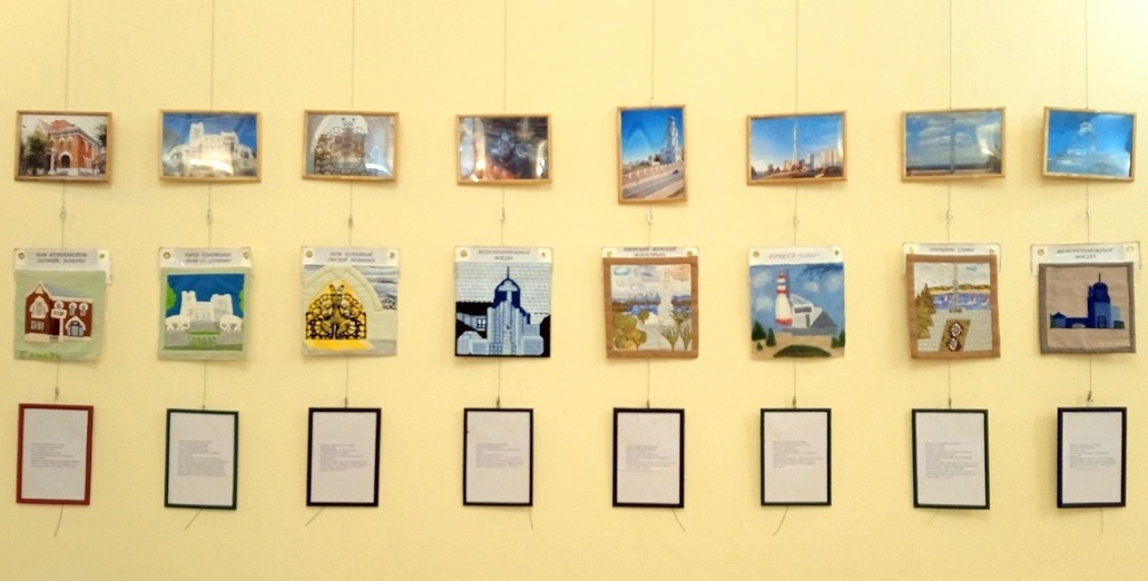 Сейчас все страницы нашего путеводителя местные могут своими глазами увидеть на выставке в Доме культуры "Заря", она открыта с утра до вечера, вход свободный. Структура выставки очень логичная: сверху - фотография места, в центре - его, места, воплощение на ткани. И внизу - короткая справка: что, где и пара фактов.