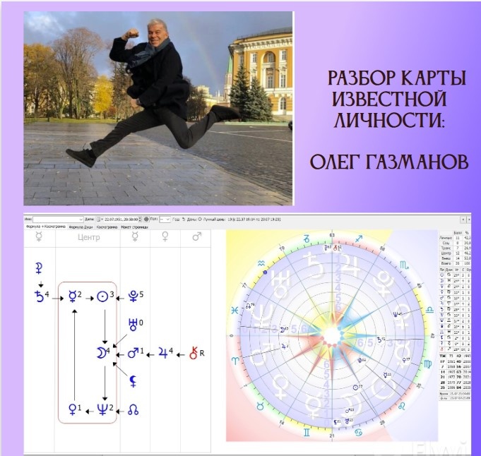 Для певца, поэта и композитора, важны такие планеты как Меркурий, Венера, Нептун, которые и стоят в центре. Солнце дает возможность светить в любой сфере, зажигать людей и наделяет творческими способностями. Луна — символ семьи, Родины, дома. Олег Газманов является народным любимцем, им написано множество патриотических песен, известно, что он выступает периодически в госпиталях перед раненными и участвует во многих патриотических концертах.