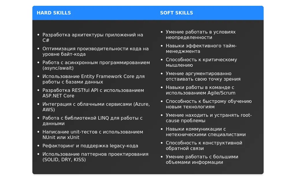 Ключевые навыки (например, знание C#, .NET, SQL, опыт работы с базами данных).