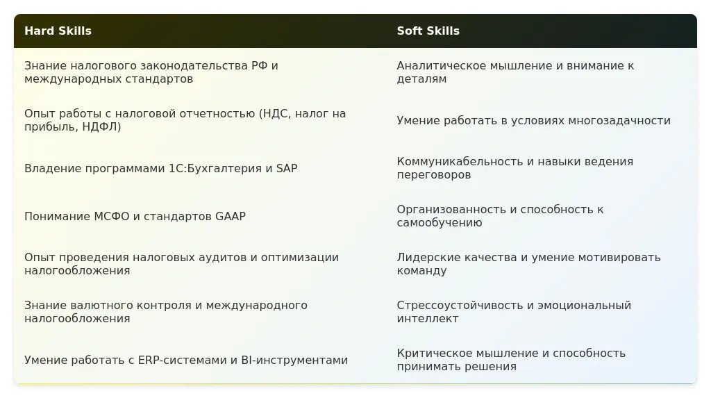 - Добавьте навыки автоматизации процессов и оптимизации налоговой нагрузки.