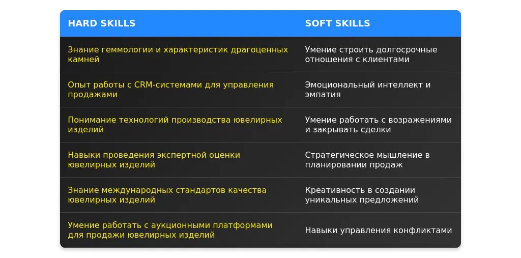Перегруппируйте навыки, чтобы они соответствовали требованиям вакансии. Например, если вакансия требует знания рынка драгоценных металлов, укажите это в разделе навыков. Выделите требуемые компетенции, такие как "работа с клиентами премиум-сегмента" или "знание ювелирных брендов".