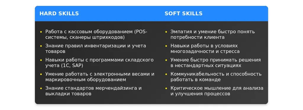 После: "Работа с кассовым оборудованием, обслуживание клиентов, знание мерчендайзинга."