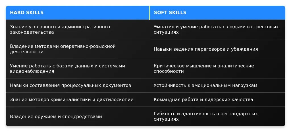 После: "Знание уголовного кодекса, опыт работы с базами данных, проведение оперативно-розыскных мероприятий."