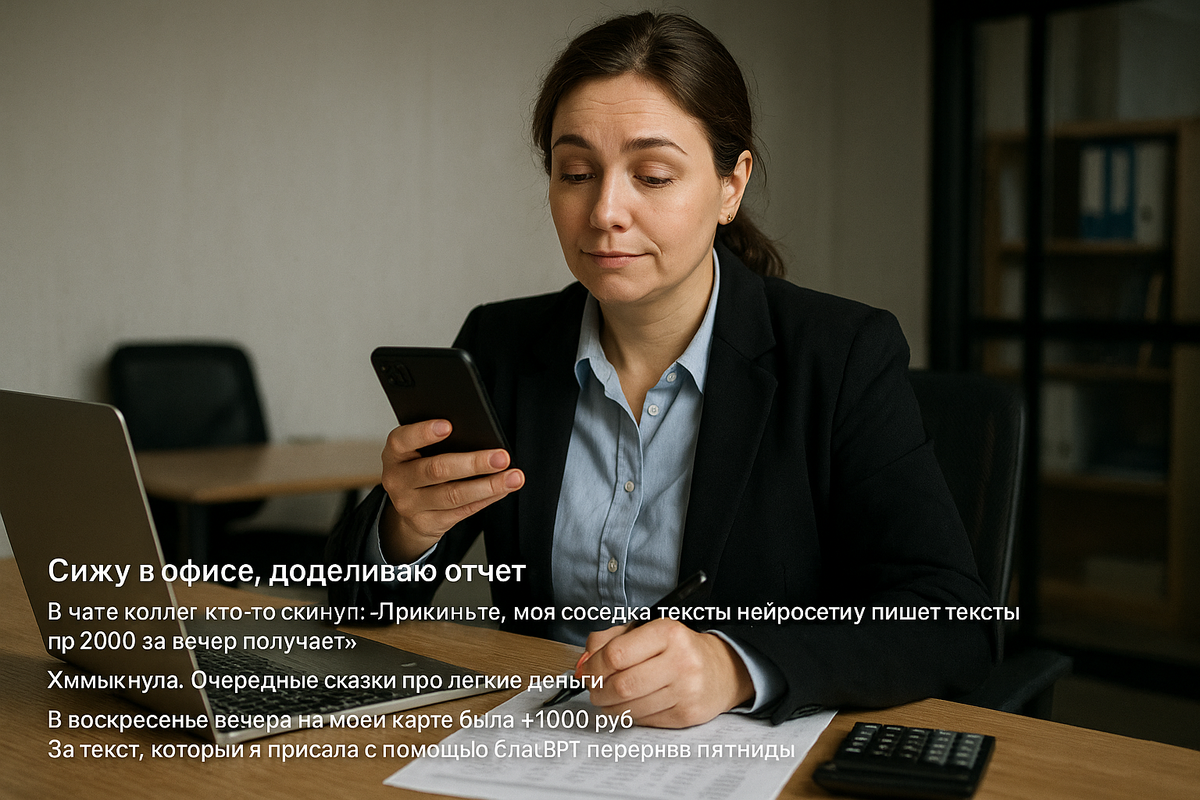 В воскресенье вечером на моей карте было +1000 рублей. За текст, который я написала с помощью ChatGPT за обеденный перерыв в пятницу.