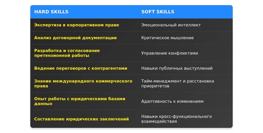 - "Знание законодательства" → "Глубокое знание корпоративного и договорного права".