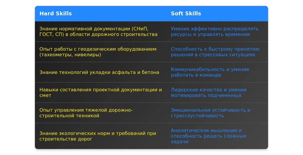 "Глубокое знание СНиП и ГОСТ, управление проектами дорожного строительства с бюджетом до 50 млн рублей."