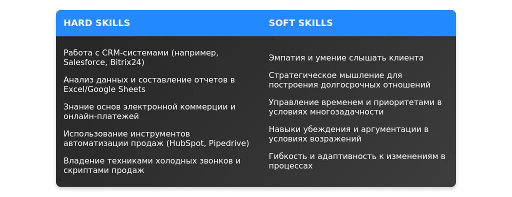 После: "Навыки дистанционных продаж, проведение холодных звонков, работа с CRM-системами (например, Salesforce), управление клиентской базой."