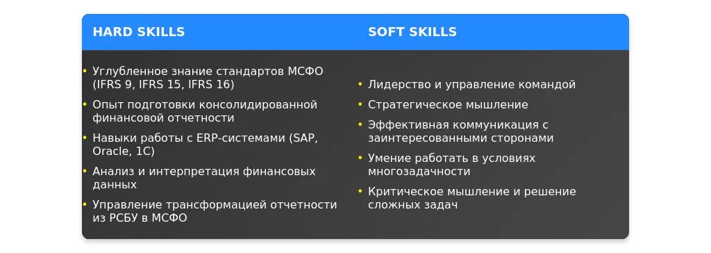 Обязательная информация: ключевые навыки, профессиональные достижения, управленческий опыт (если есть), специализация в МСФО.