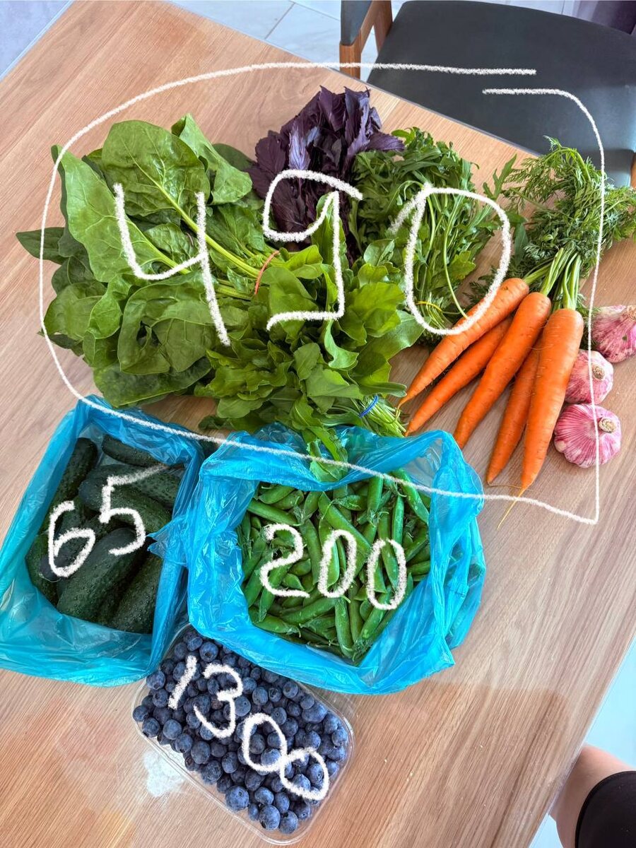 Поход на рынок 🫶 Фруктов и овощей мы едим очень много, цены тут прямо располагают 🙏 Огромный пакет зелени за 490 руб: шпинат, щавель, руккола, базилик, молодая морковь и чеснок. Пучки зелени прямо огромные) Огурчики по 65/кг, горошек 200/кг. Голубика вот не знаю, дорого это или дешево - 1300/кг, но на клубнику не успели сегодня, а она уже по 250 руб, между прочим 🫶💫
