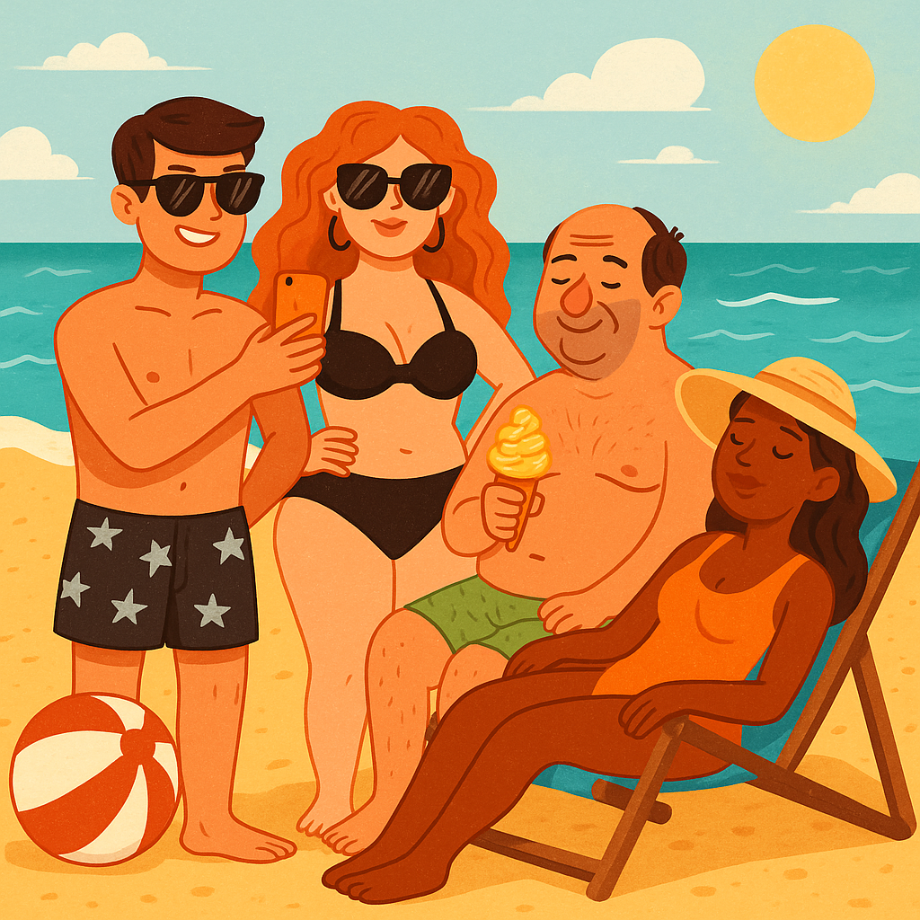 Здравствуйте, мои наблюдательные и ироничные! ☀️ Если вы хоть раз проводили лето у моря, то знаете: пляж — это не только про солнце и солёную воду. Это ещё и настоящий театр под открытым небом. Люди приезжают не только загорать, но и блистать — в меру вкуса, смелости и фантазии. Кто-то в костюмах, кто-то с колонками, кто-то с накладными ресницами, кто-то с бутербродами на шезлонге. Сегодня мы с вами составим весёлую карту летних «пляжных архетипов». Всё с улыбкой — узнаём себя, подруг и соседей по лежакам! Она появляется с утра и уходит до заката. С собой — сумка с минимумом четырьмя кремами: SPF 50 для лица, SPF 30 для тела, спрей для волос и бальзам для губ. Каждые 20 минут — повторное нанесение. Она знает про фотостарение, пигментные пятна и разницу между UVA и UVB. В купальнике — минимализм и защита. Фраза дня: «Не забывайте шею! Шея — это тоже лицо!» Вы узнаете её по ароматам. Котлеты, огурцы, пластиковые контейнеры, расстеленный плед и довольная семья вокруг. Пока дети строят пе