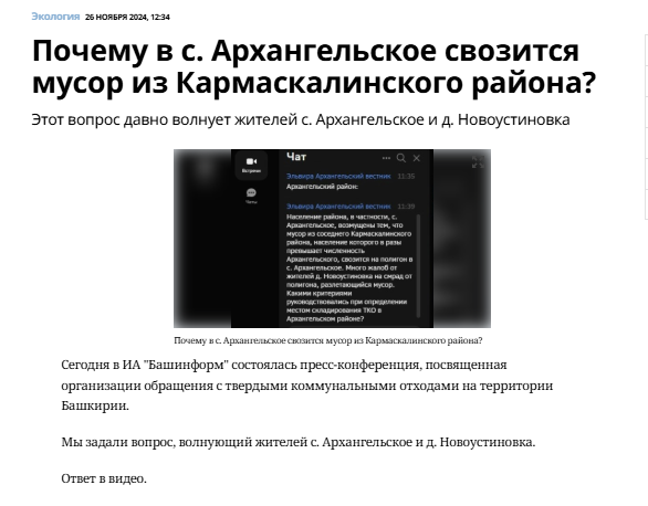 *** В агентстве «Башинформ» торжественно наградили победителей журналистского конкурса на лучшую публикацию, посвященную формированию положительного имиджа Башкирии «Профи& Профи: От первого лица». Конкурс проводился в рамках медийного коннект-клуба «Профи» — социального проекта центра креативных технологий «Медиапрофи» и информационного агентства «Башинформ». Напомним, проект для журналистов республики реализуется за счет средств Фонда грантов Главы Башкирии при поддержке Фонда грантов Главы РБ. Материал газеты «Архангельский вестник» под названием «Почему в с. Архангельское свозится мусор из Кармаскалинского района?» признан победителем в номинации «Самый читаемый материал». Он был написан по итогам онлайн пресс-конференции, которая была организована в ноябре прошлого года на площадке коннект-клуба «Профи». Актуальная статья на проблемную тему, по мнению компетентного жюри, признана лучшей в одной их трех номинаций этого конкурса. Приз победителю конкурса на лучшую публикацию, посвящ