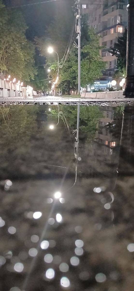 Анапа после дождя: город-отражение. 21:00. Только что закончился дождь, и мы вышли в пустую Анапу, которая теперь принадлежала только нам. Фонари рисовали на мокром асфальте золотые кружева, а в лужах — будто в чёрных зеркалах — отражались перевёрнутые деревья, крыши и силуэты старых домов. Тишина. Только редкие капли срываются с листьев платанов: тук... тук... Они падают в лужи, и отражения в них дрожат, как в аквариуме. Мы шли по набережной, где обычно толпятся туристы, — но сейчас она была тёплой и безлюдной. Море где-то в темноте дышало глухо, пахло свежестью. Это была Анапа, которую почти не видят — город, замерший между дождём и рассветом. Город, где можно услышать, как стекает вода с крыш. Где твои шаги — единственные, что нарушают покой. P.S. Лучший момент, чтобы застать это — первые 30 минут после ливня. Тогда асфальт ещё блестит, но уже не льёт с неба. И фонари зажигают всю эту магию.💧✨