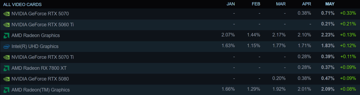 GeForce RTX 5060 Ti появилась в статистике Steam раньше Radeon RX 9070 серии