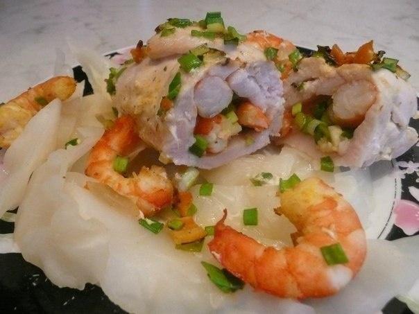 3. Выложить креветки на куриную отбивную, завернуть в рулет. Рулеты выложить в форму, залить сливками и поставить выпекаться в духовку 30 мин. при 200*С. За 10 минут до готовности посыпать оставшимся сыром.