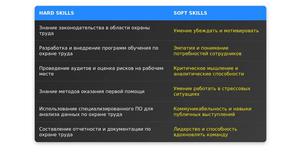 Пример 2: "Знание законодательства в области охраны труда, опыт разработки учебных программ". Обязательные требования — знание законов и навыки разработки программ, а скрытое — аналитическое мышление.