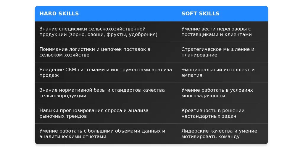 После адаптации: "Работа с ERP-системами, активные продажи, ведение переговоров, знание рынка сельскохозяйственной продукции."