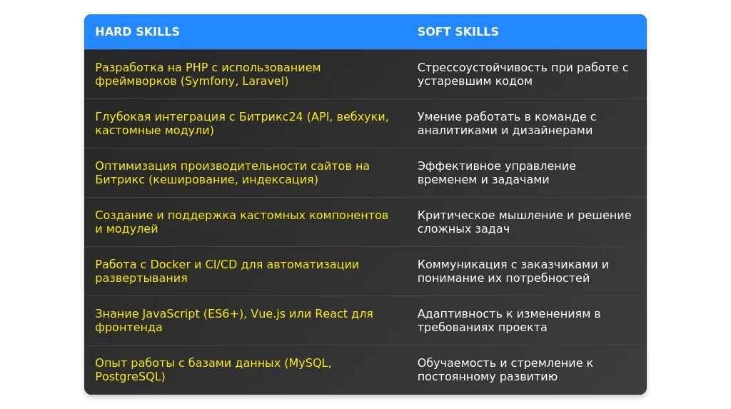 На что делать акцент: навыки работы с Битрикс, знание PHP, HTML/CSS, JavaScript, опыт работы с базами данных.