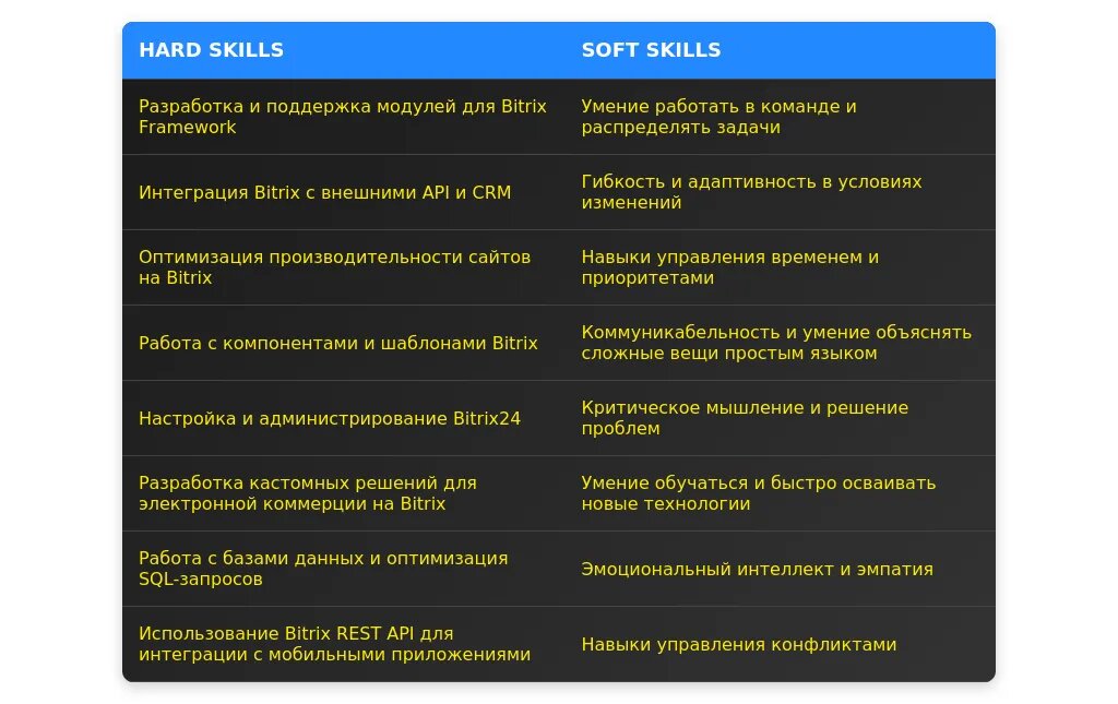 В разделе "Навыки" важно перегруппировать и выделить ключевые компетенции, которые соответствуют вакансии. Например, для вакансии web-программиста (Bitrix) можно выделить навыки работы с PHP, JavaScript, Bitrix Framework и MySQL.