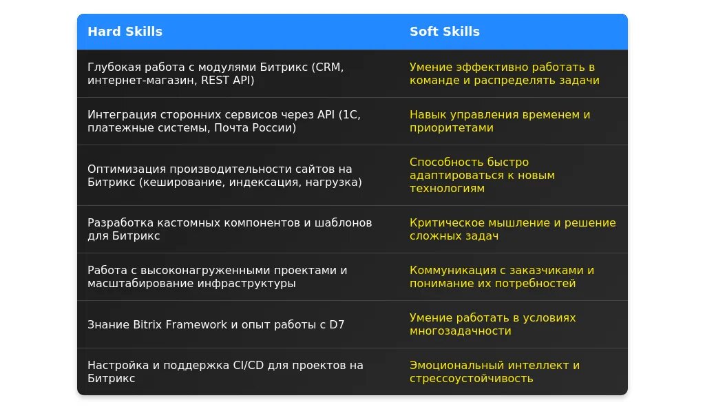После адаптации: "Битрикс, PHP, MySQL, REST API, оптимизация производительности, интеграция с CRM."