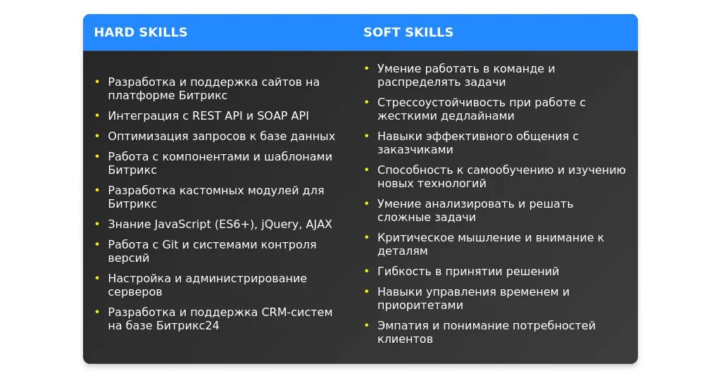 В разделе "Навыки" перегруппируйте ваши компетенции, чтобы выделить те, которые наиболее соответствуют вакансии. Например, если вакансия требует опыт работы с API Битрикс24, укажите это в начале списка.