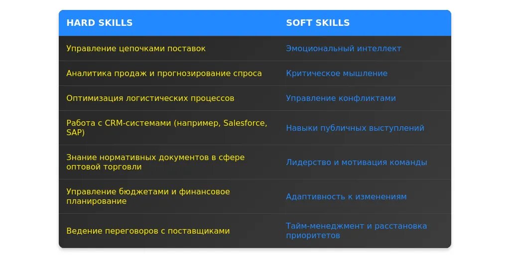 После адаптации: "Навыки ведения переговоров с поставщиками, стрессоустойчивость в условиях высокой нагрузки."