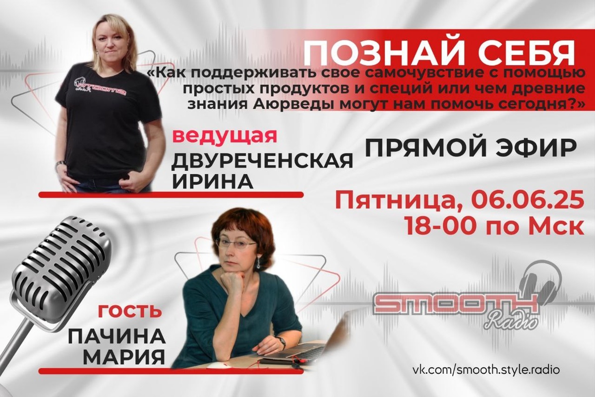 «Как поддерживать свое самочувствие с помощью простых продуктов и специй или чем древние знания Аюрведы могут нам помочь сегодня?» 06.06.25 в 18-00 в прямом эфире https://vk.com/smooth.style.radio 🧐Шоу "Познай себя"🧐 Ведущая - Ирина Двуреченская Гостья - Мария Пачина В прямом эфире с специалистом Аюрведы мы узнаем: 🔎 что такое Аюрведа простыми словами, почему аюрведа по-прежнему актуальна на протяжении веков? 🔎 кому может помочь? 🔎 о современной Индии, поездках в аюрведические клиники и в Гималаи; 🔎 и многое другое… 📌 Пять тысяч лет – такой срок впечатляет, не так ли? Даже знаменитые пирамиды в Гизе не дотягивают до этой планки. А вот индийская система медицины Аюрведа может этим похвастаться. Об отношении к жизни, которому она учит, кому и почему аюрведа может помочь, мы и будем говорить с гостьей эфира. Смотрите прямую трансляцию на https://vk.com/smooth.style.radio - прямая трансляция будет в контакте, в ленте сообщества, и после эфира на странице Ирины. Прямые ссылк