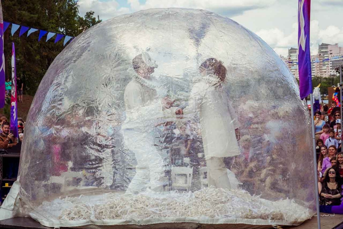 Артисты самарского театра «Пластилиновый дождь» ехали на гигантском велосипеде. Мимы в образе ангелов из питерского театра «Вокруг» охотно взаимодействовали со зрителями. Они обнимались со зрителями, поднимая им настроение.