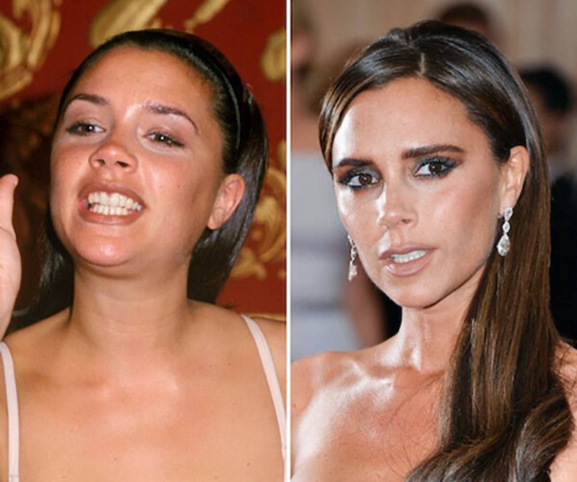 Если откатиться во времена Spice Girls, улыбка Вики выглядела так себе: маленькие неровные зубки, наклонённые назад, скученность (особенно внизу) и узкие зубные ряды — при широкой улыбке были видны те самые щёчные коридоры (чёрные пустые треугольники между зубами и щеками). Улыбка была не «кинозвёздная». Теперь же — очевидно, она обратилась к классным специалистам: коронки, перед постановкой которых (не предполагаю, а утверждаю — говорю это с экспертной точки зрения, как ортодонт) было орто