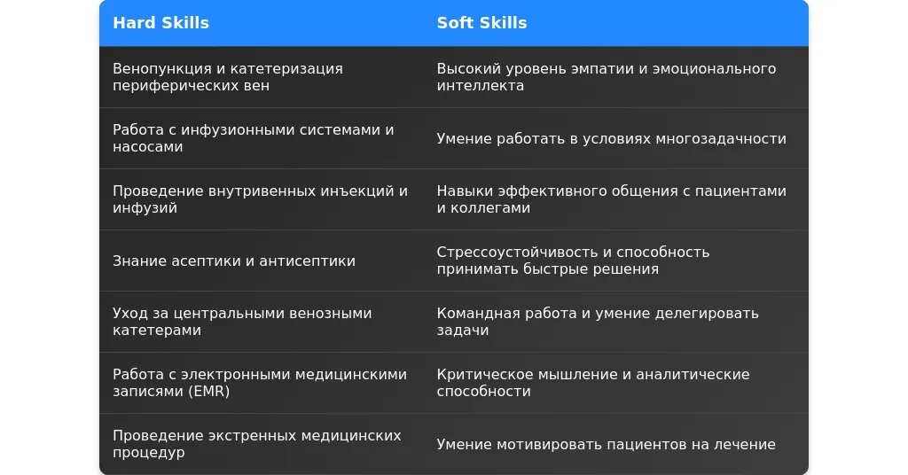 - Базовые навыки: забор крови, обработка ран, работа с медицинской документацией.