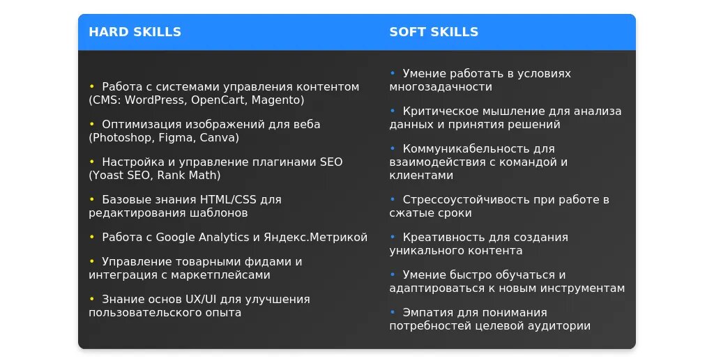 Навыки и качества: акцент на умении работать с CMS, знании основ SEO, навыках написания и редактирования текстов.