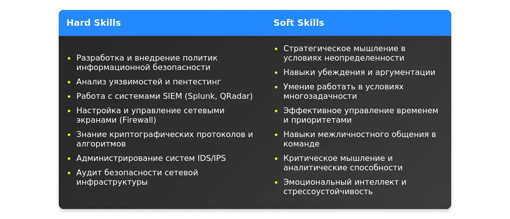 Ключевые фразы для вакансий: "внедрение систем защиты", "анализ инцидентов безопасности", "аудит соответствия стандартам".