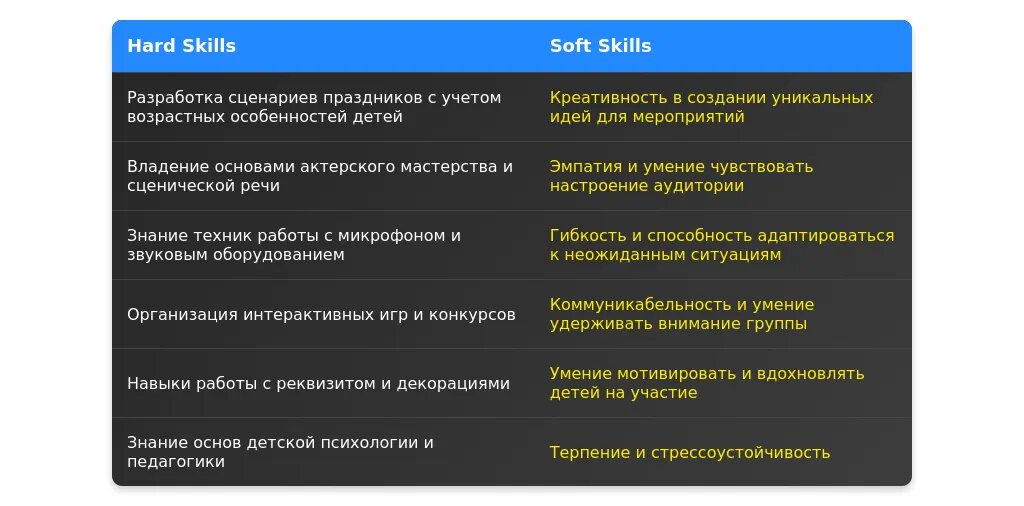 При анализе вакансии для профессии "ведущий детских праздников" важно обращать внимание на обязательные и желательные требования. Обязательные требования — это те, без которых кандидат не будет рассматриваться, например, опыт работы с детьми или наличие соответствующих сертификатов. Желательные требования — это дополнительные навыки, такие как умение работать с аудиторией разного возраста или знание современных тенденций в организации праздников.