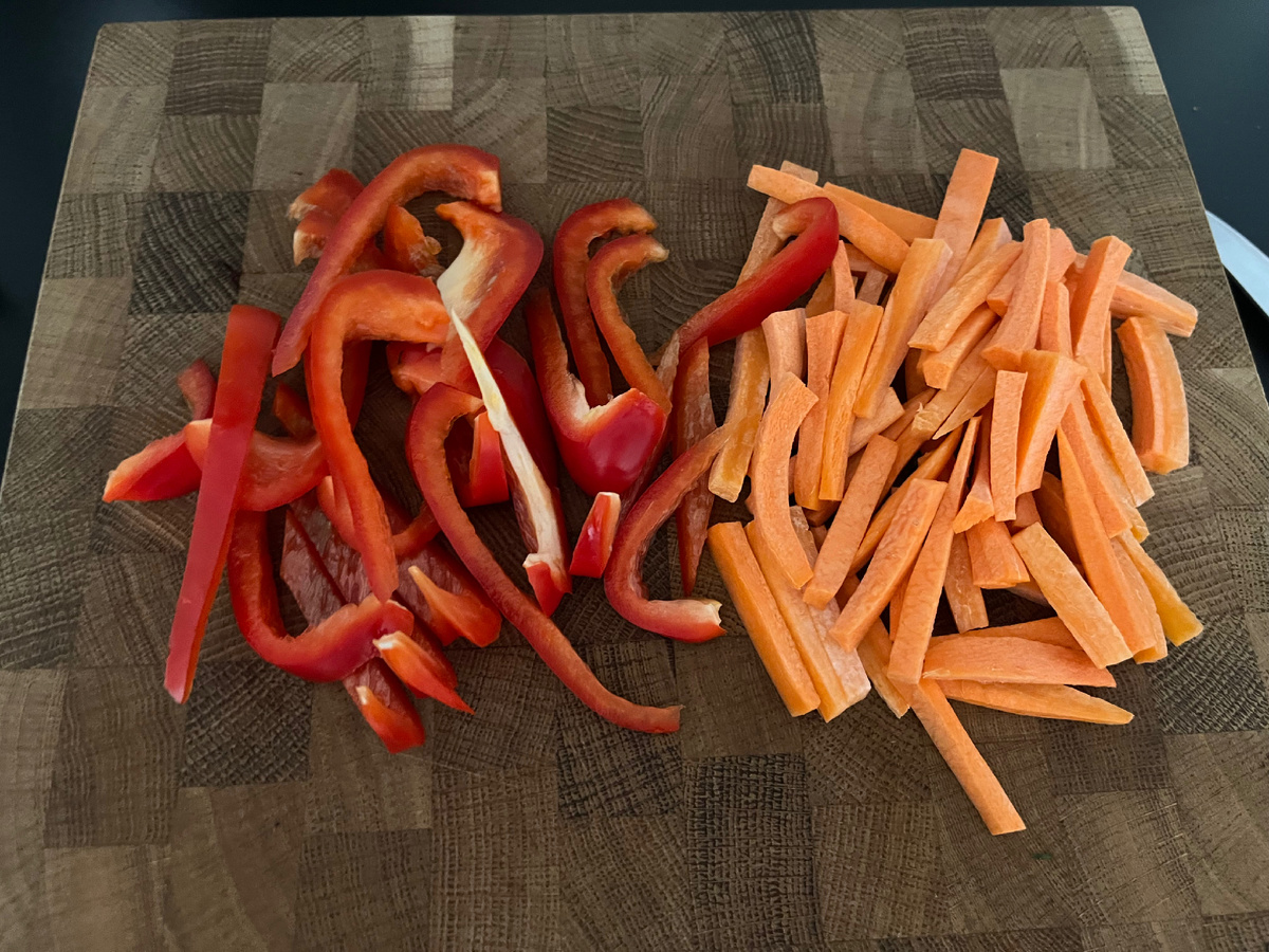 С недавних пор стараюсь есть больше белка, куриные сердечки в этом случае неплохой вариант. Куриные сердечки 400гр. Болгарский перец 1 шт. Баклажан 1 шт. Морковь большая 1 шт. Лук 1шт. Чеснок 2 зубчика Пучок кинзы Соевый соус 50-70 мл. Базилик, имбирь По желанию корица, яблочный уксус, сахар Кунжут для подачи Для начала нарезаем все овощи брусочками/полосками вот так: Если сердечки не очень крупные, не нарезаю их. На хорошо прогретую с маслом сковороду отправляем сначала лук - до золотистого цвета на достаточно сильном огне. Далее кидаем к нему морковь, минут на 5 не больше, масло я не добавляю. Следом идет перец - ему хватит и пары минут. Перекладываем овощи в тарелку, а в сковороду бросаем сердечки. Не смешиваем, чтобы не получилась каша, овощи размокнут, и все это будет тушиться. Сердечки обжариваем около 15 мин на среднем огне. И перекладываем это в тарелку, к овощам. Теперь очередь баклажанов, они идут в ту же сковороду примерно минут на 7-8. Предварительно наливаю совсем