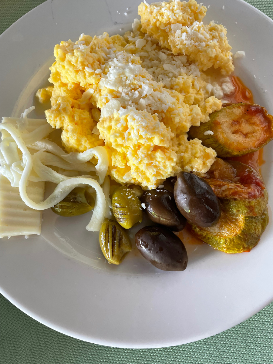 Всем приветы 😊😊😊 Как-то я ни разу не выкладывала завтраки)) все только ужины)) На завтрак в России я ем кашу -гречку или пшенную. В отеле есть только рисовая. Я ее не люблю. Поэтому перешла на омлет или яичницу. Сверху насыпала тертого сыра ! Плюс запеченные кабачки и еще немного сыра. Парочка оливок - одни большие черные с косточкой, вторые оливки гриль. Оливок и маслин на выбор ооочень много: вот тут 12 емкостей с разными видами. И крупные, и мелкие, и резаные, и черные, и зеленые, и с косточками, и без. И они есть разные по цвету - по вкусу они также немного отличаются. Мне больше всего еще понравились малиновые и фиолетовые. Но точно определить с каким они вкусом я не смогла. Также есть масло домашнее или сливки домашние. Не знаю что это точно. Очень вкусно, такие мягкие, нежные, сливочные. Скорее похоже на натуральные сливки с молока. По консистенции как мороженое или очень густая сметана. Ярко выраженного вкуса не имеют. Я их использую вместо масла на свежеиспеченные бу