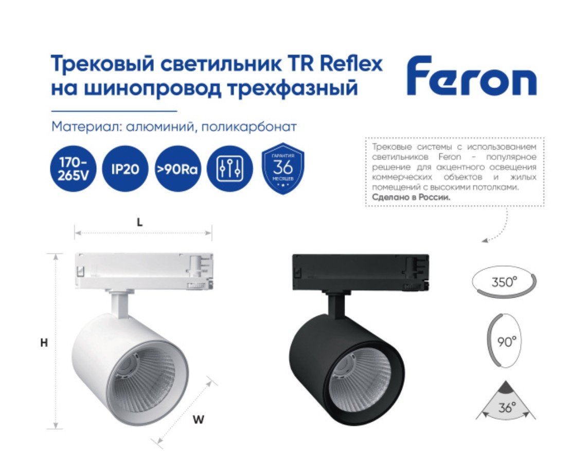 Светильник произведен на территории России и рассчитан на длительное использование — гарантия составляет 36 месяцев. Это подтверждает стабильность характеристик и уверенность производителя в качестве выпускаемой продукции. Как часть серии трековых решений Feron, модель вписывается в концепцию гибкого освещения, подходящего как для профессиональных, так и для бытовых задач.