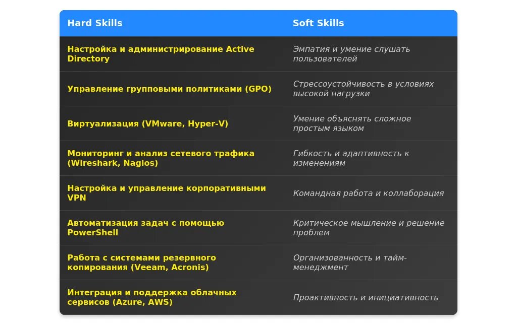 - Акцент на навыки: Упоминайте конкретные технологии (Active Directory, тикет-системы).