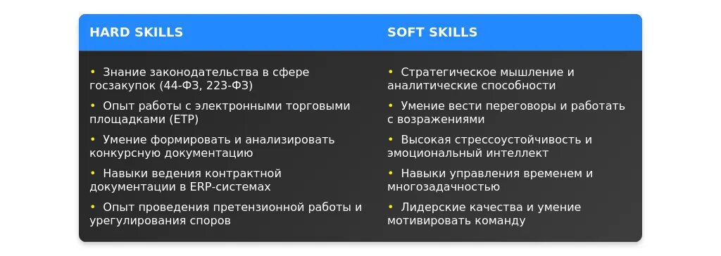 Анализ: обязательные требования — опыт работы с госзакупками и знание законодательства; желательные — навыки ведения переговоров.