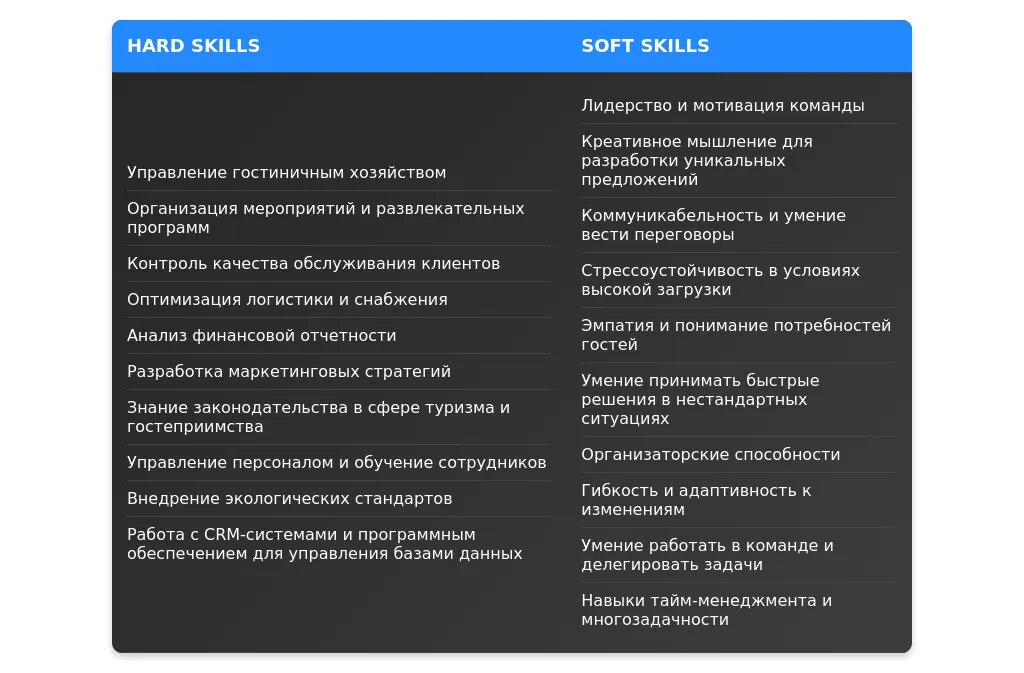 - Баланс навыков: "Управление персоналом, бюджетирование, работа с CRM, организация мероприятий."