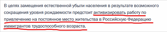 В 2007 году президент России подписал Указ от 09.10.2007 № 1351 "Об утверждении Концепции демографической политики Российской Федерации на период до 2025 года". В этом документе впервые на государственном уровне был использован термин "замещающая миграция". Основной проблемой называлось сокращение населения из-за низкой рождаемости, и главным инструментом её решения должна была стать миграция. Конкретно указывалось: "обеспечить миграционный прирост на уровне более 300 тыс. человек ежегодно". Примечательно, что в 2007 году безработица составляла 6%, и о "кадровом голоде" речи не шло. То есть целью миграционной политики было не восполнение рабочих рук, а именно замещение убывающего населения. Интересно, что с 2000 по 2015 год рождаемость в России увеличивалась, а в 2013–2015 годах был даже естественный прирост (рождаемость превышала смертность). Однако в указе не было механизмов сокращения миграции в случае улучшения демографии. Наоборот, предполагалось усиление миграционного потока при
