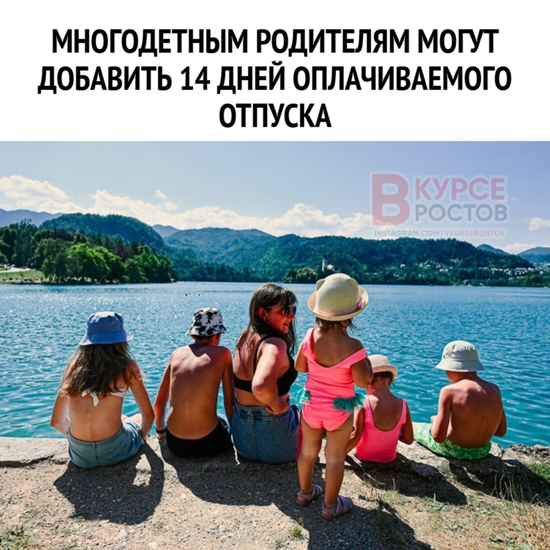 В Госдуму внесён законопроект о предоставлении многодетным родителям (3 и более детей) 14 дней дополнительного оплачиваемого отпуска. Отпуск можно использовать в удобное время, но нельзя перенести на следующий год.