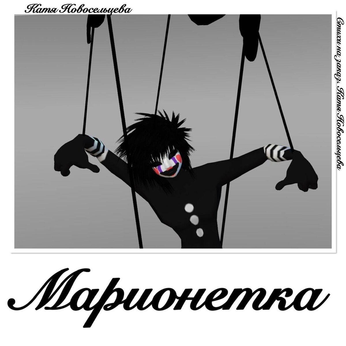 Марионетка Катя Новосельцева А вдруг меня не существует? Я просто в чьей-то голове. Когда пронзит тот разум пуля, Романс мой будет резко спет. Я буду век марионеткой. Играй со мной, мой господин. У куклы мир весь исковеркан. Она попала в лабиринт. Ты подари мне силу воли. И пусть сердца не бьются в такт. Проснись, прошу тебя! Не стоит Судьбой моей всю жизнь играть. 20.11.2022