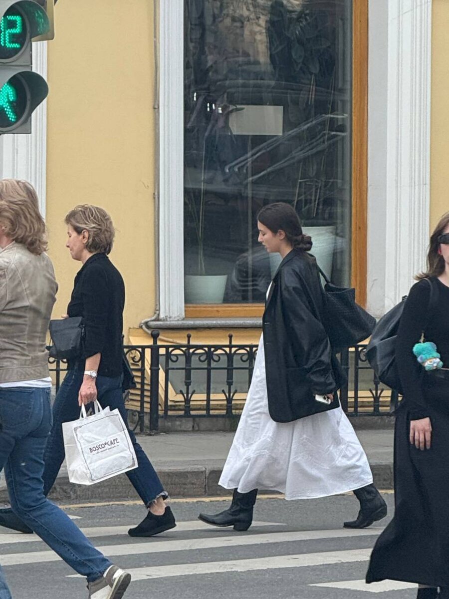 Увидела у Саши папарацци пост + её модные заметки и поняла, что в телефоне копятся крутые образы случайных прохожих 💔 надеюсь, они не будут против тут засветиться. Обожаю наблюдать за людьми Комбинация: хлопковая юбка + кожаный жакет — это вау. Дополняем плетёной сумкой и казаками 🤐