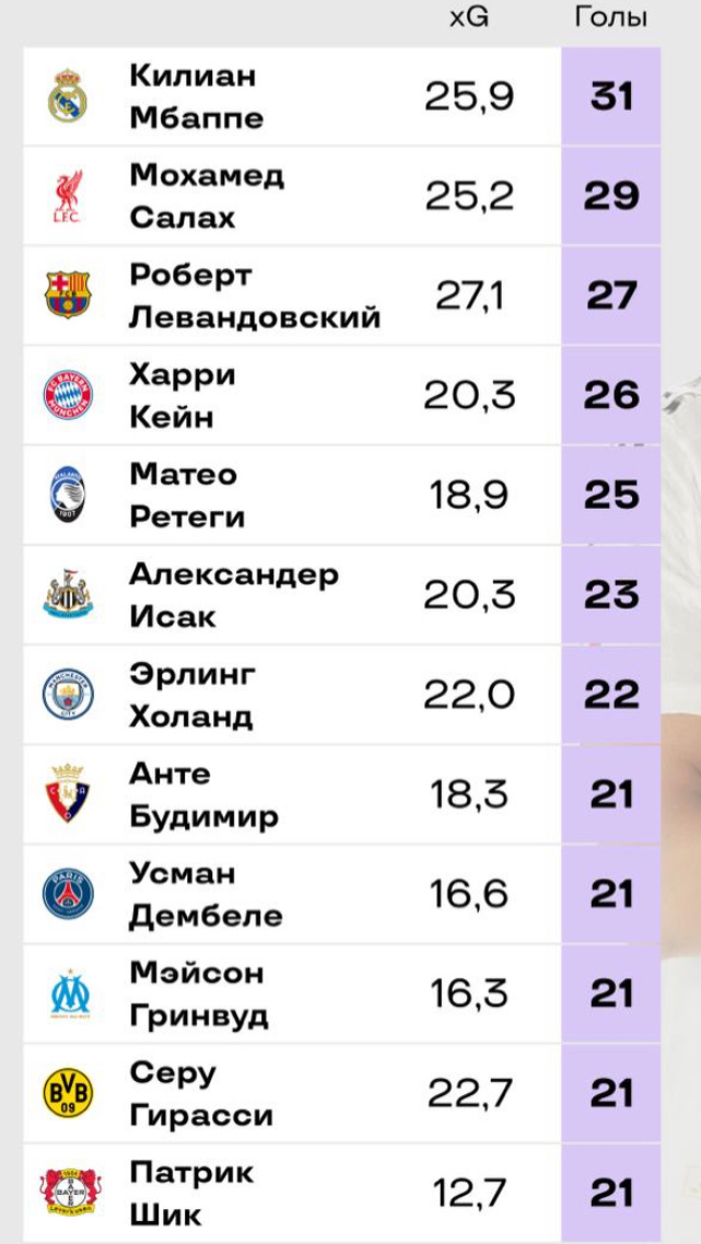 Завершился футбольный сезон, подаривший нам море эмоций и незабываемых моментов! ⚽️ Килиан Мбаппе, Мохамед Салах, Патрик Шик – эти имена навсегда войдут в историю. Давайте углубимся в статистику, проанализируем ключевые показатели и попробуем предсказать, кто станет королем футбола в следующем сезоне! Мбаппе: Король Франции и Европы👑 Килиан Мбаппе продемонстрировал выдающуюся результативность, забив 31 гол в чемпионате Франции. Но что стоит за этими цифрами? Система xG (ожидаемые голы) показывает, что Мбаппе превзошёл ожидания, забив на 5 голов больше, чем предполагала система. Это свидетельствует о его выдающемся мастерстве и умении реализовывать моменты. Салах: Египетский фараон на пике формы 🇪🇬 Мохамед Салах, несмотря на возраст, продолжает демонстрировать стабильно высокий уровень игры. Его 28 голов в Премьер-лиге – это впечатляющий результат. Система xG показала, что Салах забил примерно столько, сколько и ожидалось, что говорит о его высокой эффективности. Шик: Невероятный ове