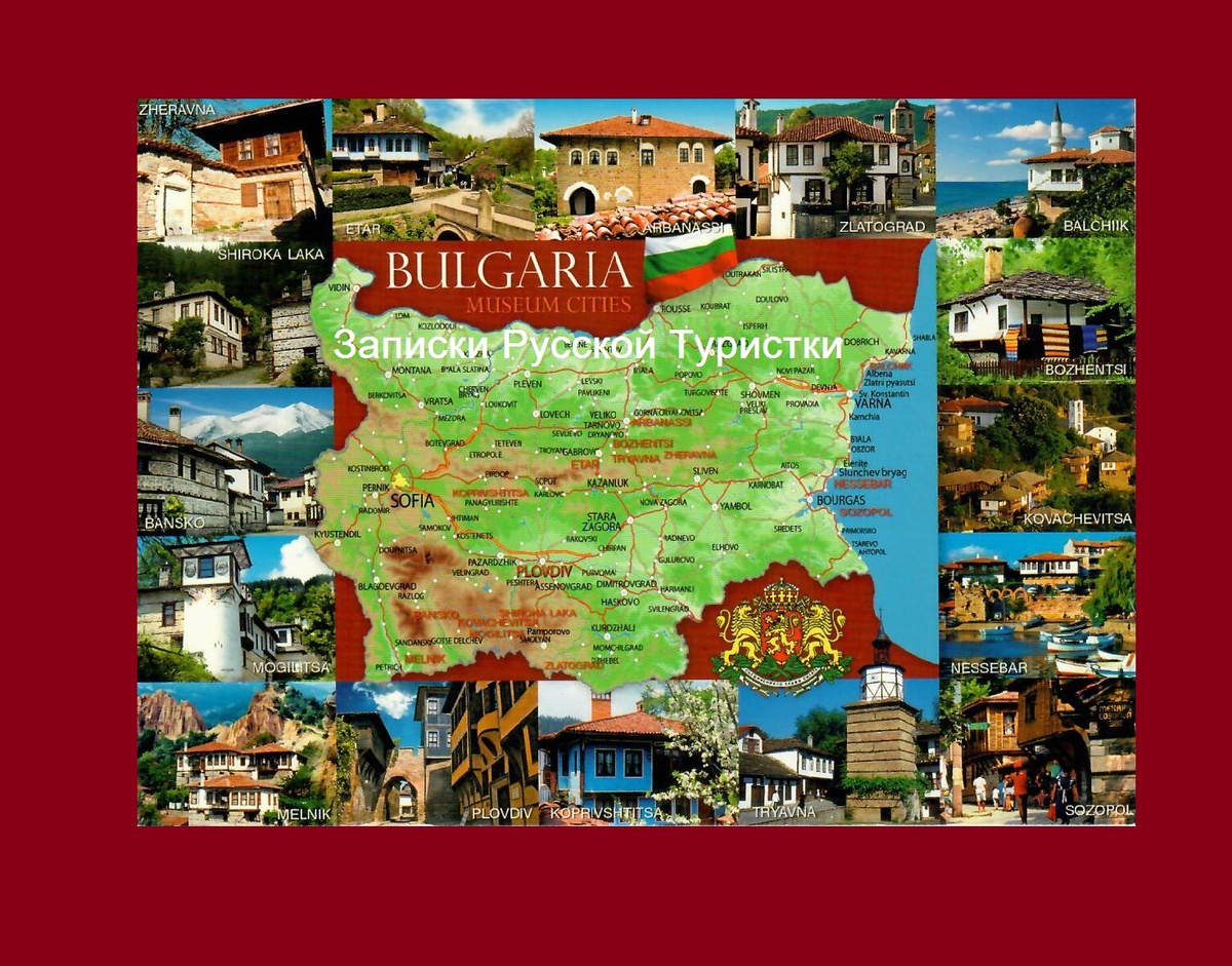 На этой открытке мы видим географическую карту Болгарии, государственный герб, а также выборочные фото достопримечательностей городов-музеев страны.