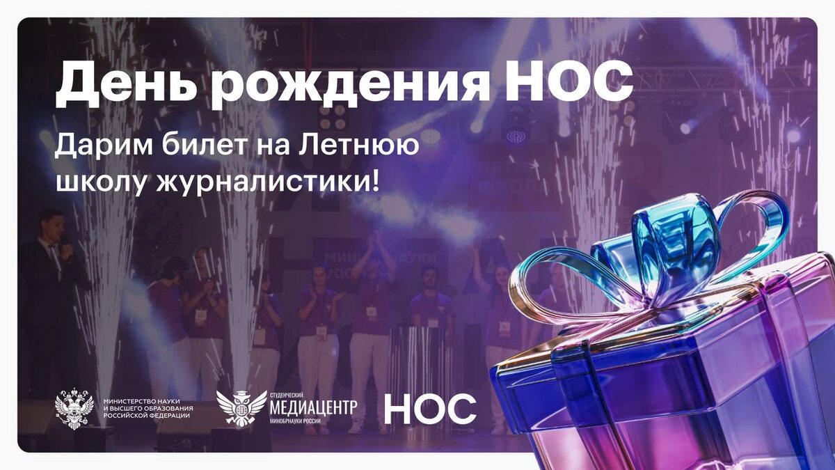 Подарки, подарки и ещё раз подарки! 🚀 В честь дня рождения НОС мы решили сделать нашим подписчикам по-настоящему большой подарок. Разыгрываем три билета на IV Летнюю школу журналистики Минобрнауки России — ежегодное мероприятие для самых талантливых молодых медийщиков нашей страны! 5 ярких дней образовательных мастер-классов и тренингов, создание собственных медиапроектов и многое другое! Капитальная «прокачка» для тех, кто хочет стать активистом СМЦ Минобрнауки России 📍 Калужская область ⏰ 20-25 июля ⚡️ Проживание, питание, участие и трансфер из Москвы за счёт организаторов Хотите попасть на одно из самых ярких событий этого лета? До 11 июня пишите в бот НОС ФИО, вуз и ваше предложение по концепции мероприятия — идеи интерактивов, задания, лозунга и интересных «фишек». Трём студентам-авторам лучших идей мы подарим билеты на ЛШЖ ➡️ НОС. Подписаться