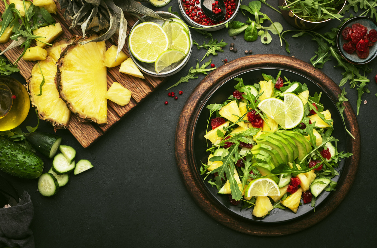 - Аккуратно разместите сверху огурец, ананас и авокадо.
