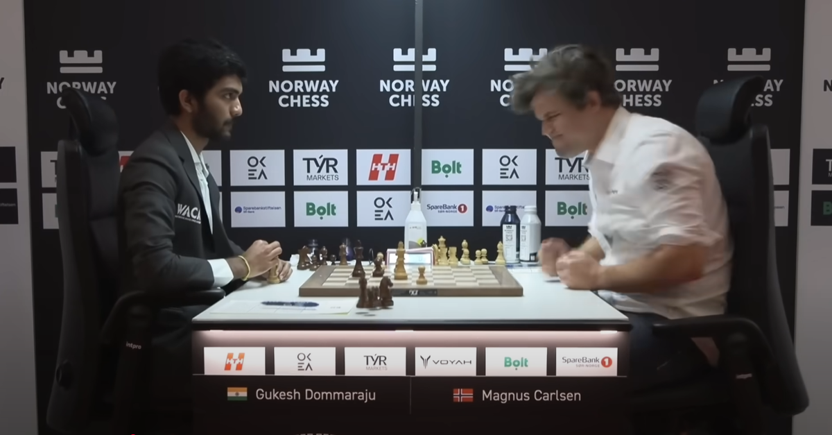 Магнус Карлсен и новый чемпион мира Гукеш Доммараджу наконец сошлись лицом к лицу. Оба сыграли на турнире Norway Chess в Ставангере – впервые после того, как индиец завоевал шахматную корону в классике. Первую партию Магнус уверенно забрал белыми, но вторая едва не довела его до истерики. Просто взгляните, чем все кончилось. В эндшипиле 19-летний Гукеш с лишним конем обскакал проходные пешки норвежца, и тот, признав поражение, вспылил. Съежился и треснул кулаками по столу! И сгоряча воскликнул Oh my God! («Боже мой!») Наглядна и реакция Гукеша. Он явно был в шоке от взлетевших в воздух фигур. Показалось, что и конь рядом с доской будто взбрыкнул и повалил стоявших сзади пешку со слоном. Гукеш с испуганным видом отъехал на стуле и недоверчиво взглянул на Карлсена. Тот поспешил протянуть руку. Доигрывали на секундах. Итог побоища – в виде рухнувшего короля Карлсена на доске. Норвежец извинился и, выходя из зала, по-отечески хлопнул соперника по спине, который, кажется, опять вздрогнул. Э