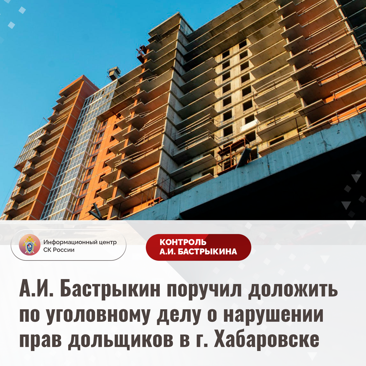 А.И. Бастрыкин поручил доложить по уголовному делу о нарушении прав дольщиков в г. Хабаровске