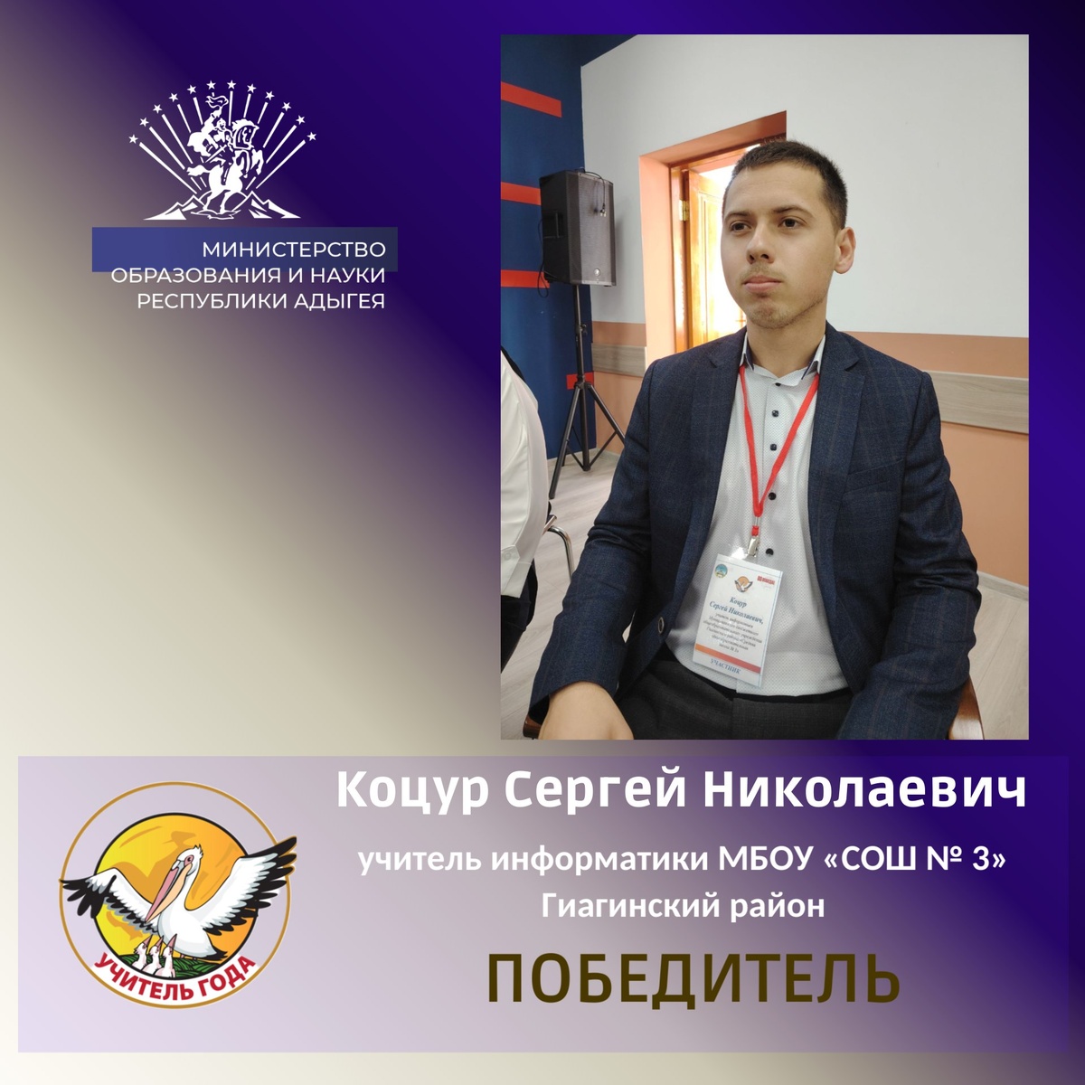 📢 Подведены итоги регионального этапа Всероссийского конкурса «Учитель года – 2025»! 🎉 ✨ Поздравляем победителя — Коцура Сергея Николаевича, учителя информатики Муниципального бюджетного общеобразовательного учреждения Гиагинского района «Средняя общеобразовательная школа № 3». Он заслуженно завоевал звание лучшего, проявив исключительные компетенции, креативность и глубокое понимание своей профессии. Также поздравляем призеров: Джантаева Алексея Алексеевича, Касумову Ангелину Идрисовну, Кудинову Анжелику Ивановну, Сташ Рамазана Аслановича. Вы — настоящие образцы профессионализма и вдохновения для коллег и учеников! Особая благодарность всем участникам конкурса! Ваше участие — это яркое проявление профессиональной ответственности, стремления к развитию и постоянного совершенствования. Впереди у нас торжественное закрытие конкурса и чествование победителей, которое обещает стать ярким и запоминающимся событием! Следите за новостями!✨